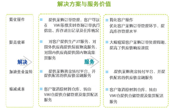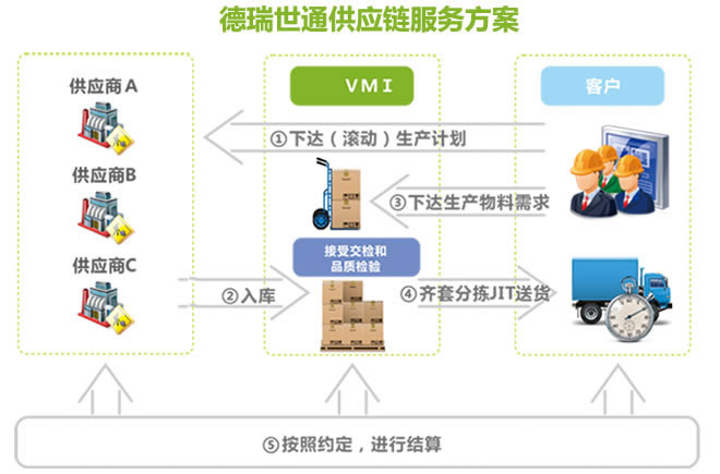 生產(chǎn)型企業(yè)的供應(yīng)鏈涉及原材料采購(gòu)、物料供應(yīng)、生產(chǎn)管理、倉(cāng)儲(chǔ)及物流管理、產(chǎn)品銷(xiāo)售管理等多個(gè)領(lǐng)域,采購(gòu)模式與結(jié)算方式多樣,供應(yīng)鏈環(huán)節(jié)較多,流程較長(zhǎng),供應(yīng)商及料件體系龐大,統(tǒng)籌管理工作量大。 德瑞世通的生產(chǎn)型供應(yīng)鏈服務(wù),可將原有的多家供應(yīng)商對(duì)企業(yè)、以及企業(yè)對(duì)多家下游客戶(hù)的“多對(duì)一”、“一對(duì)多”復(fù)雜模式轉(zhuǎn)變?yōu)槠髽I(yè)對(duì)德瑞世通的“一對(duì)一”的運(yùn)作模式。